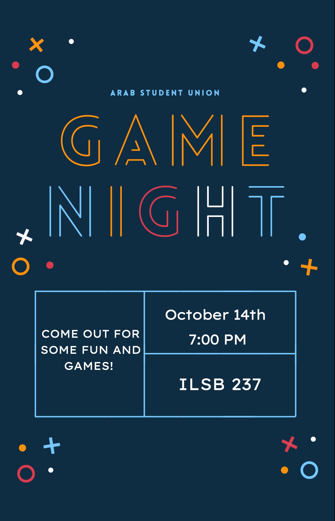 This Thursday, October 14th at 7:00 pm, we will be having a game night in ILSN 237. Pease feel free to bring some games if there are ones you want to play. I hope to see you there!