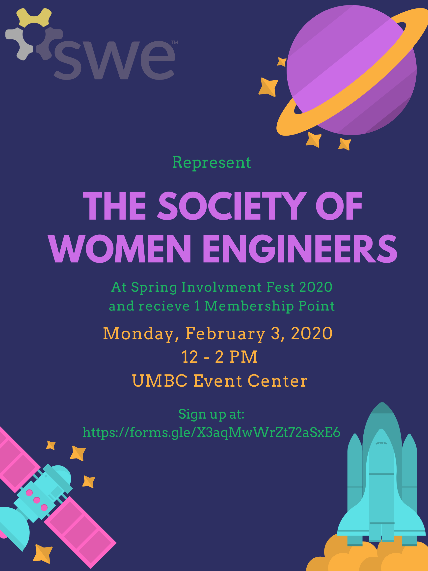Come volunteer with SWE at Involvement Fest this Spring semester! Click on the link below to access the sign up form.