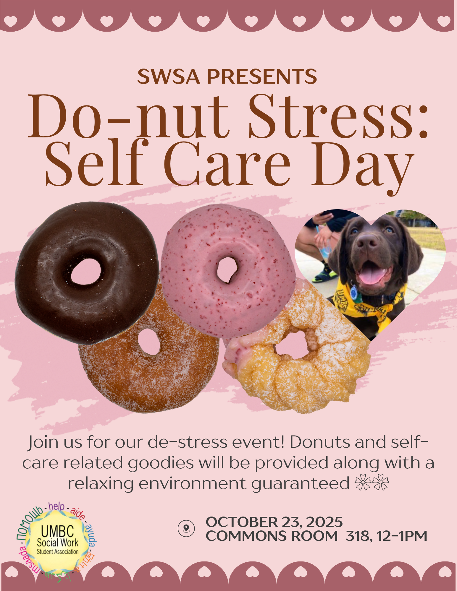Join us for our second October GBM as we participate in a series of de-stress activities and games while we enjoy donuts and welcome a very special guest! This event will take place Commons Room 318, on October 23rd from 12-1PM. See you there :)