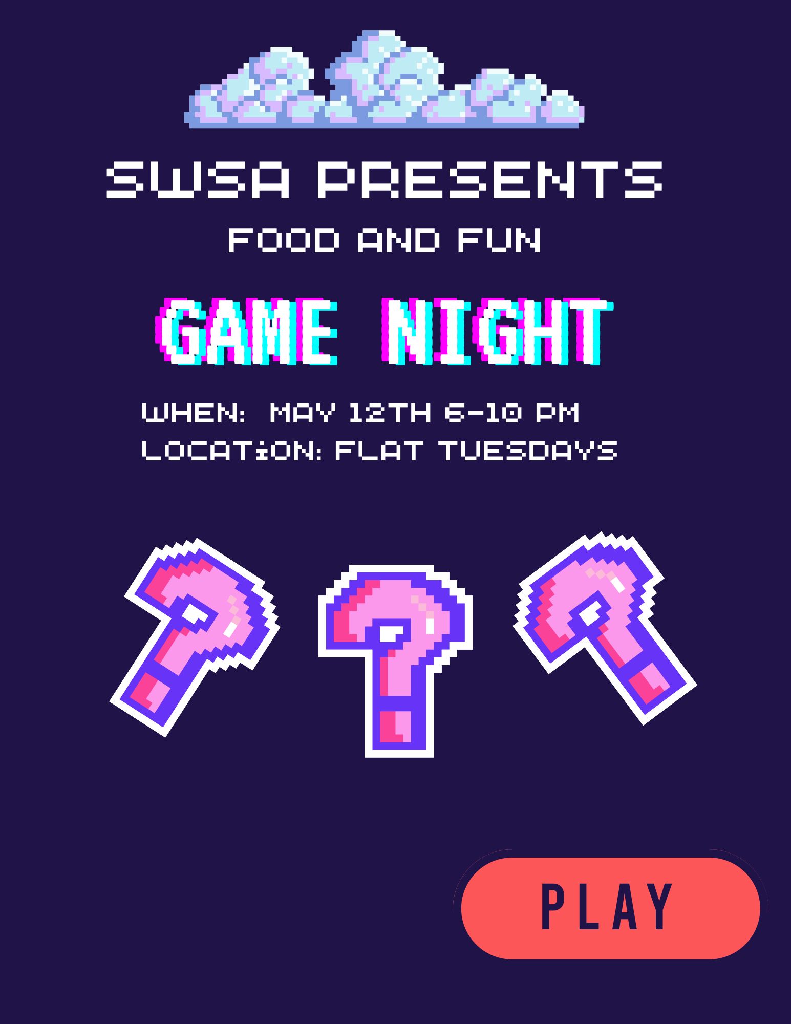 On Friday May 12th we will be having a game night. All majors are welcome. In addition, we will be doing a farewell for the social work students that are graduating this semester. Food and snacks will be provided. We hope to see you there.