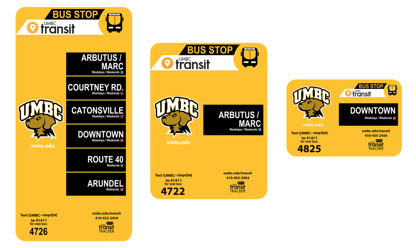 Shuttle bus routes connecting #RetrieverNation with our college towns - Arbutus, Catonsville, and Baltimore - are now more visible thanks to new, eye-catching black and gold signs that proudly display UMBC's mascot True Grit. We appreciate our partners at the Baltimore County Planning Department, Maryland Transit Authority (MTA), neighborhood associations, and business associations for their support of this initiative to better define access points for UMBC Transit boarding and highlight our college towns.