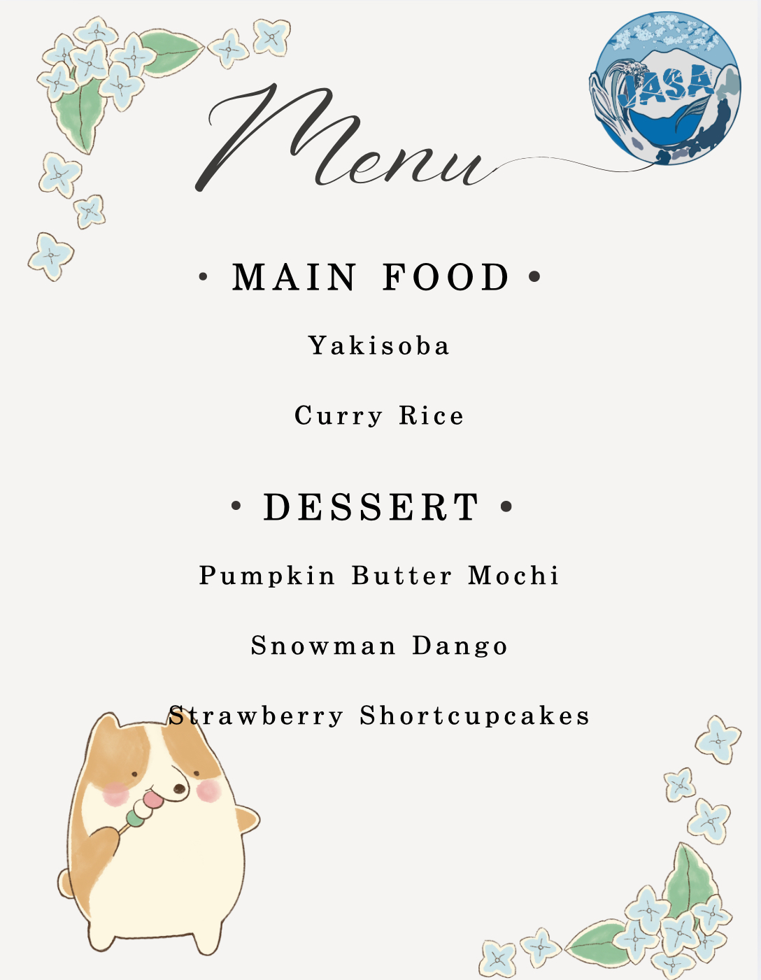 Hi everybody! I hope everyone is excited for our Winter Festival that is going to be happening tomorrow from 5-9PM in the Harbor Hall MPR Room! This is going to be our food menu that we will be serving tomorrow! To give you guys a little bit of an idea what our schedule is going to be like...