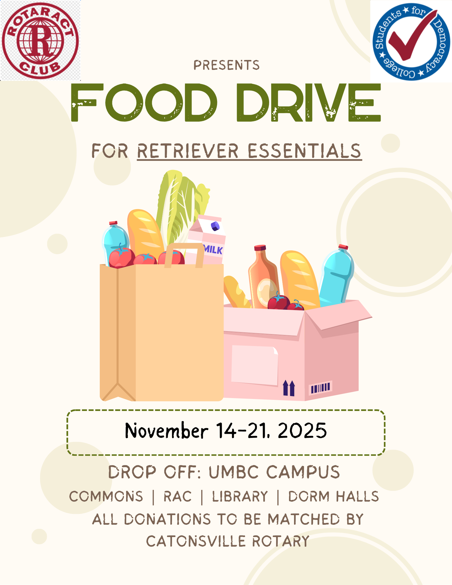 Join us in donating non-perishable food items to Retriever Essentials in anticipation of the upcoming holiday, Thanksgiving. November 14-21 look for a Rotaract labeled bin in any one of the locations listed above including Commons, RAC, Library, dorm halls and lecture buildings.