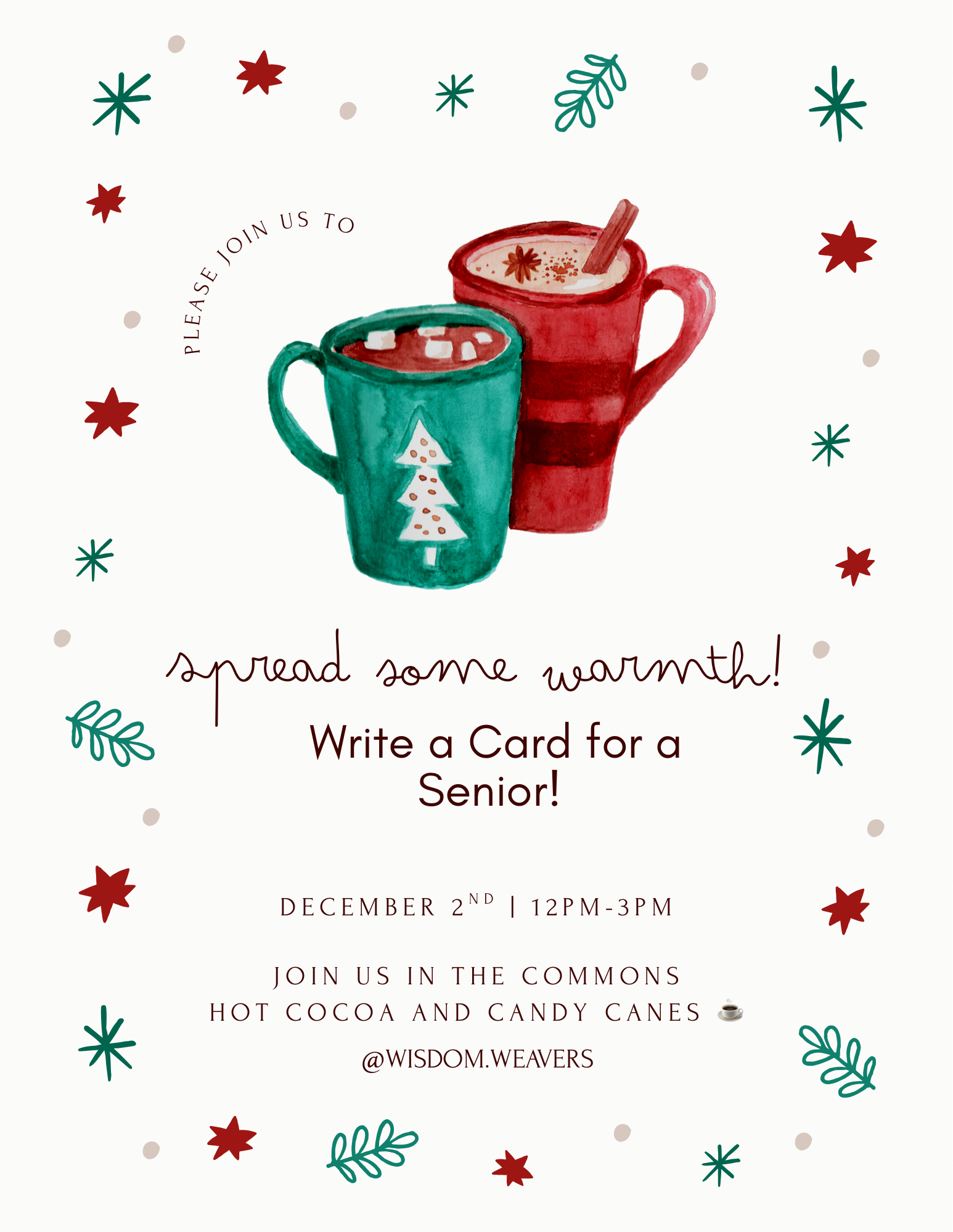 We hope you can stop by and "create some warmth" by making a friendly greeting card for an older adult in our community. Come by and see the Wisdom Weavers on Tuesday 12/2 in The Commons between 12-3. We will have treats!