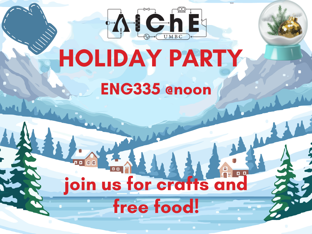 Join AIChE for our annual Holiday Party in ENG 335, on Monday, December 8 at noon. We will have crafts, snacks, and time to destress before finals. Happy Holidays!