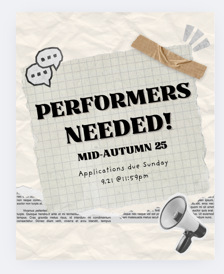 We are looking for performers to join our general body dance for our Mid-Autumn Festival on October 17th! No experience is needed, just bring a motivation to learn and have fun dancing!