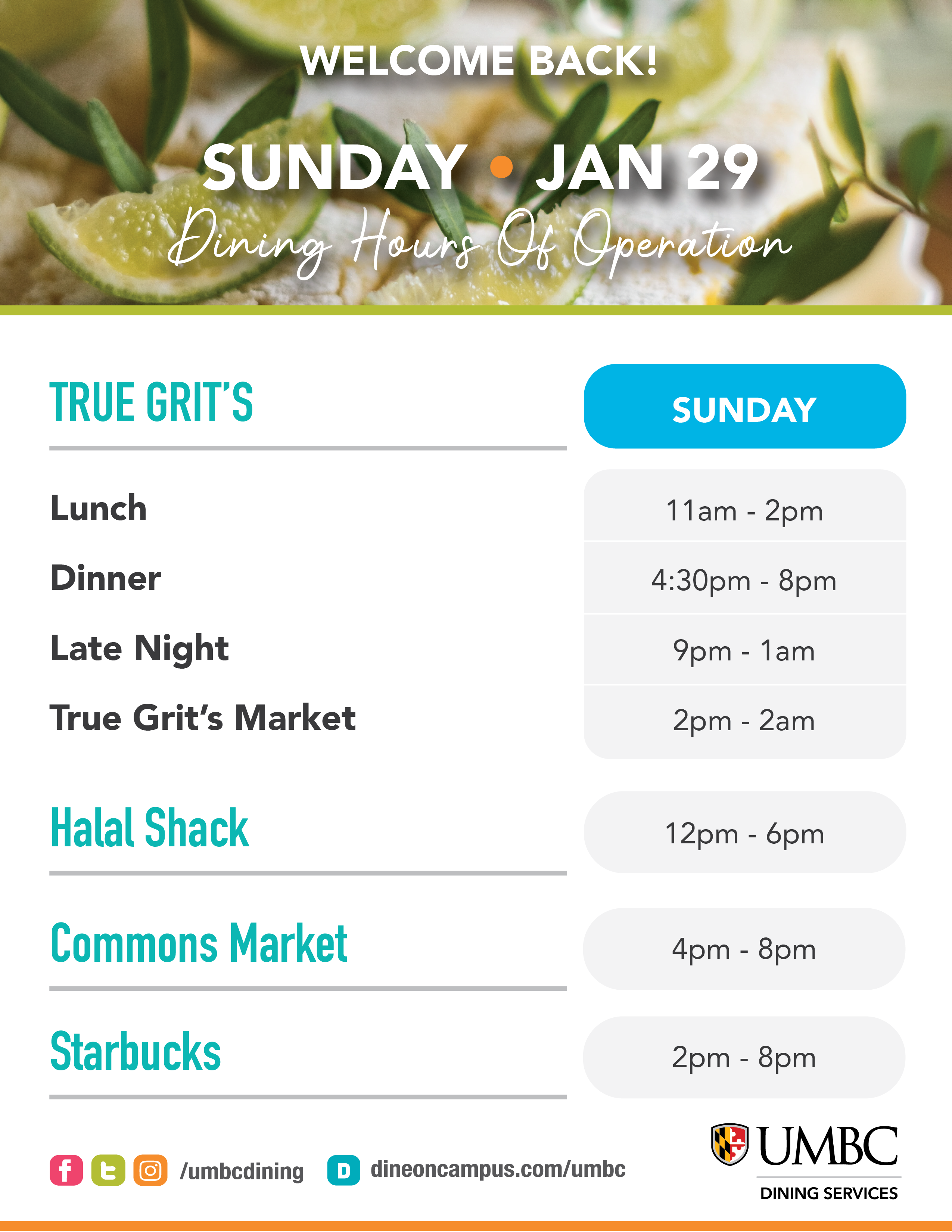 We are so excited to start the spring semester with you! Please find our hours for Sunday, January 29th. I will be updating our Spring Semester hours in the next few days. The biggest change to the Spring Semester hours is that Halal Shack will be open later and Salsaritas will be closing earlier.