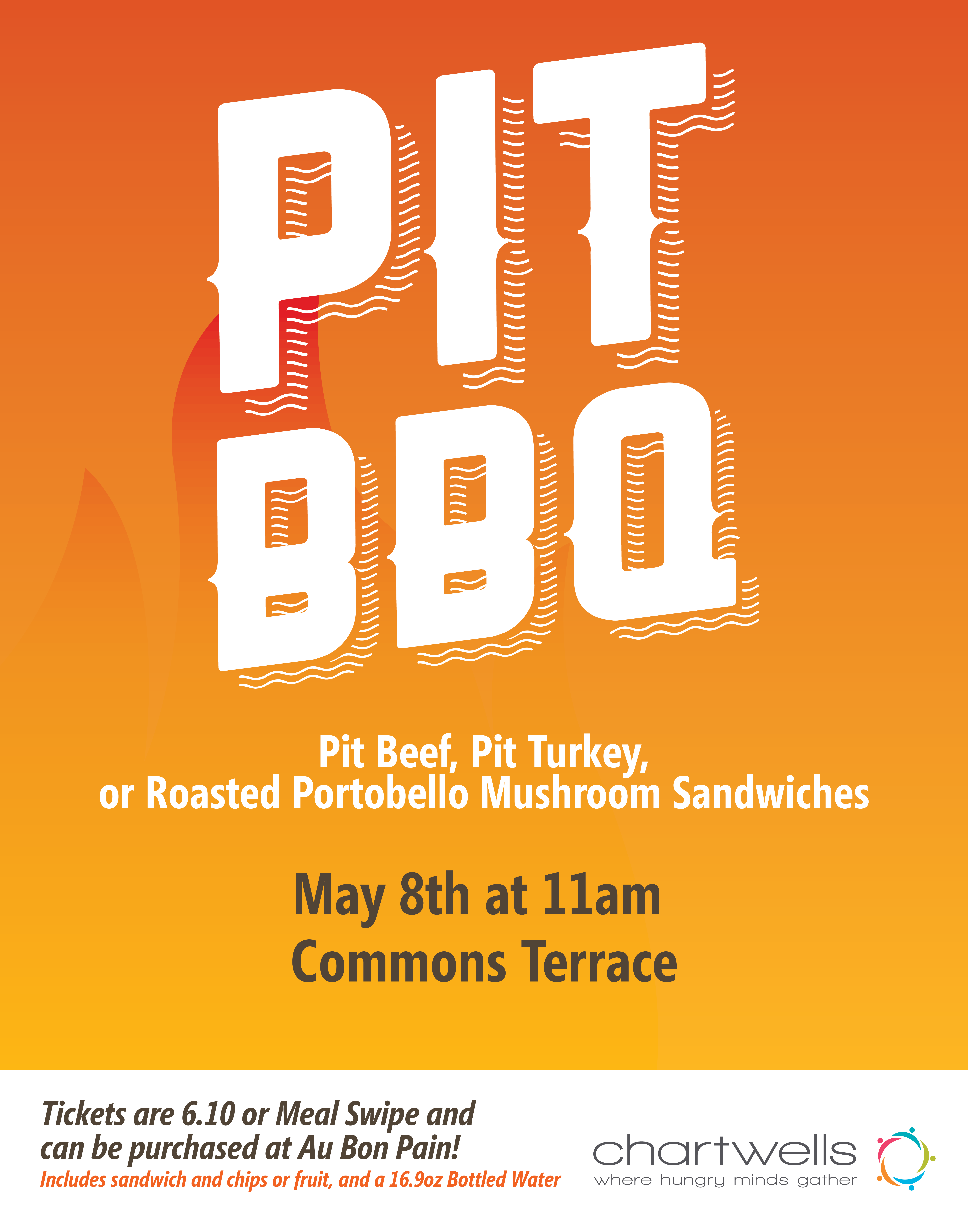Join us May 8th on the Commons Terrace starting at 11 am and enjoy Pit Beef, Pit Turkey or a Roasted Portabella Mushroom Sandwich. Use your lunch swipe at Au Bon Pain or swipe for $6.10!