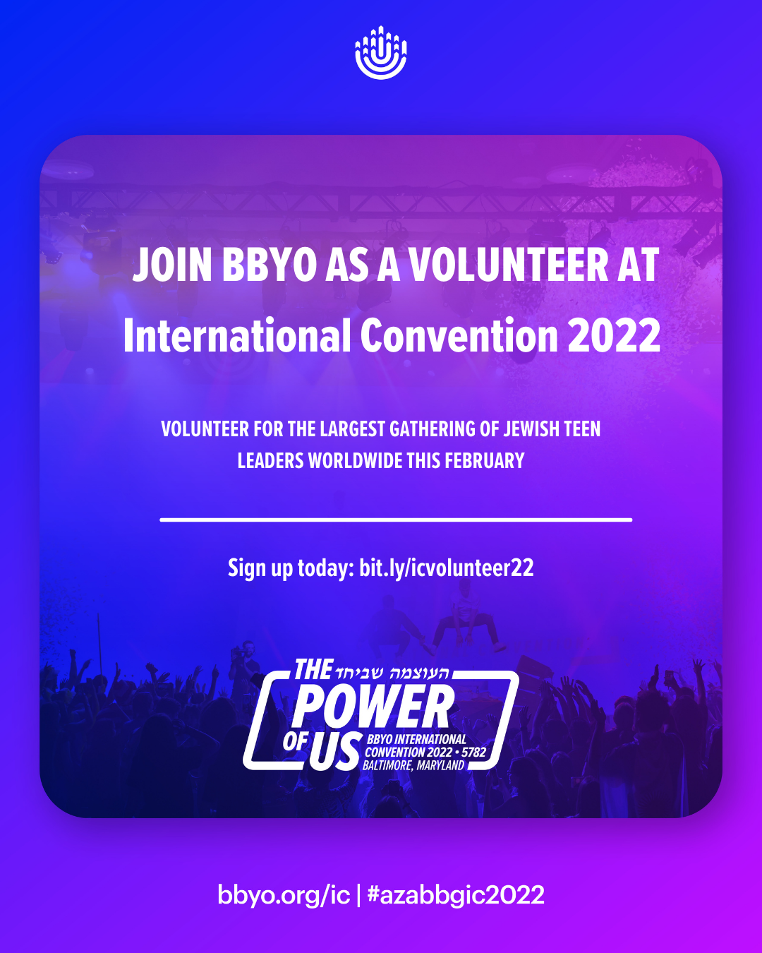 Over President’s Day weekend, BBYO will welcome more than 3,000 Jewish teen leaders to Baltimore for BBYO International Convention (IC). We need volunteers and hoping you could help us spread the word to UMBC students and alumni. We’re looking for 300+ volunteers in various roles from Wednesday, February 16 through Monday, February 21. Volunteering opportunities will be distributed across convenient shifts, and all volunteers are given full access to IC signature events. We ask that all volunteers fill out this form and have graduated from high school in 2020 or before. Questions? Please contact Ilana Kornblatt at ikornblatt@bbyo.org