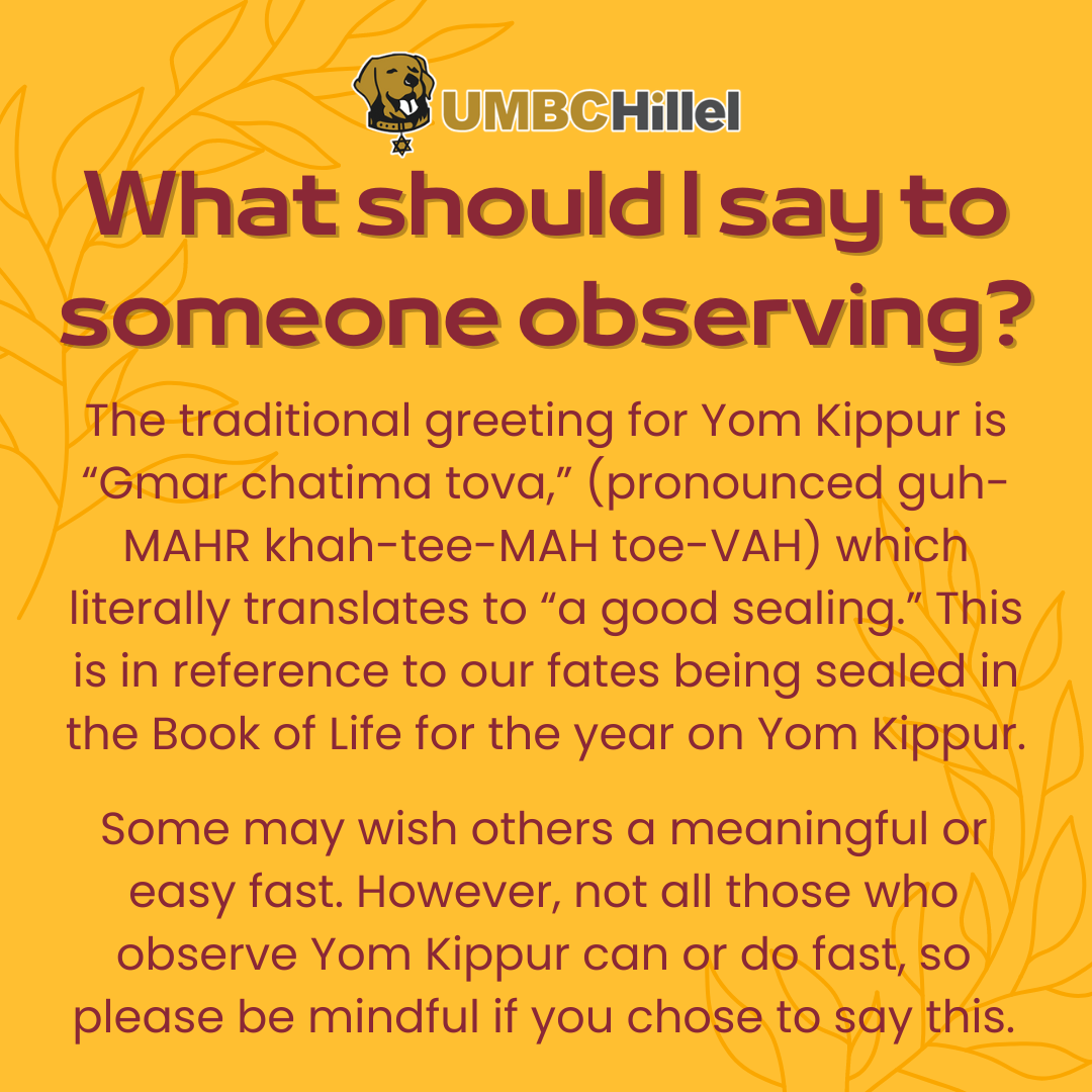 The traditional greeting for Yom Kippur is “Gmar chatima tova,” (pronounced guh-MAHR khah-tee-MAH toe-VAH) which literally translates to “a good sealing.” This is in reference to our fates being sealed in the Book of Life for the year on Yom Kippur. Some may wish others a meaningful or easy fast. However, not all those who observe Yom Kippur can or do fast, so please be mindful if you chose to say this.