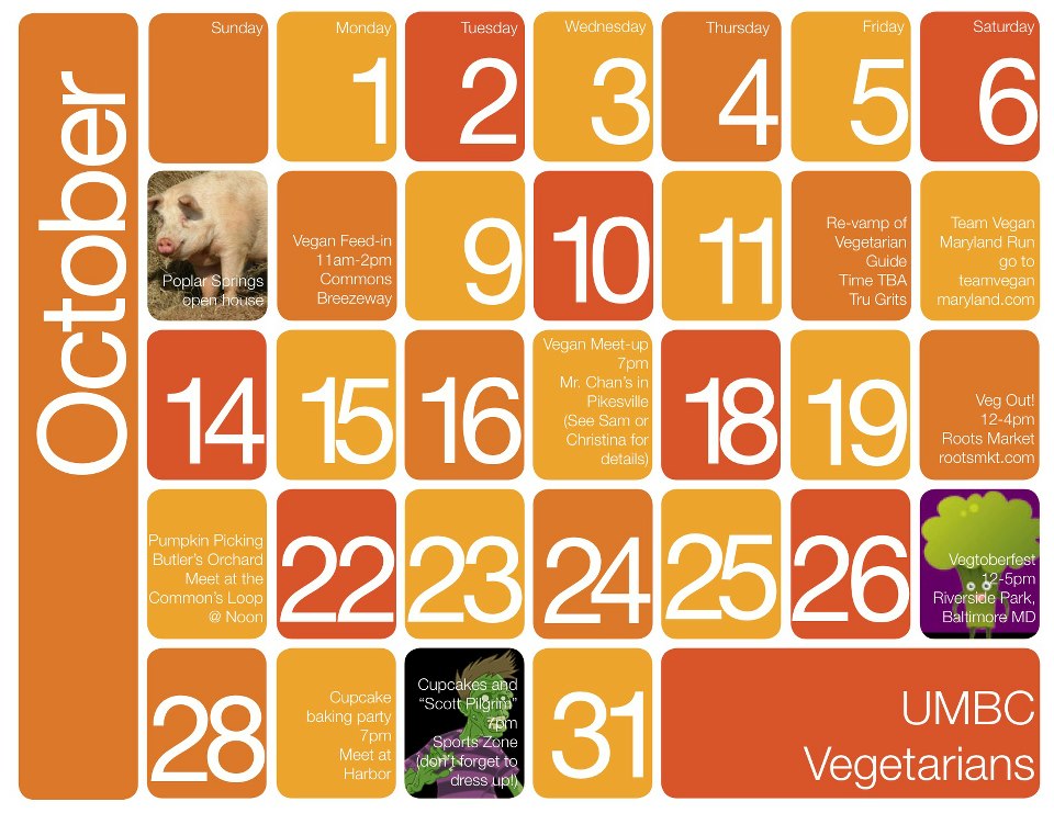 Hey all, so Christina, one of our members made this awesome calendar for veg events in the area for October. She'll be making a calendar for every month (this was the first calendar made) and we'll be uploading the full calendars to our myUMBC group every month. Check out all of our events! And email samw2@umbc.edu for more info/check out our Fb group page!!