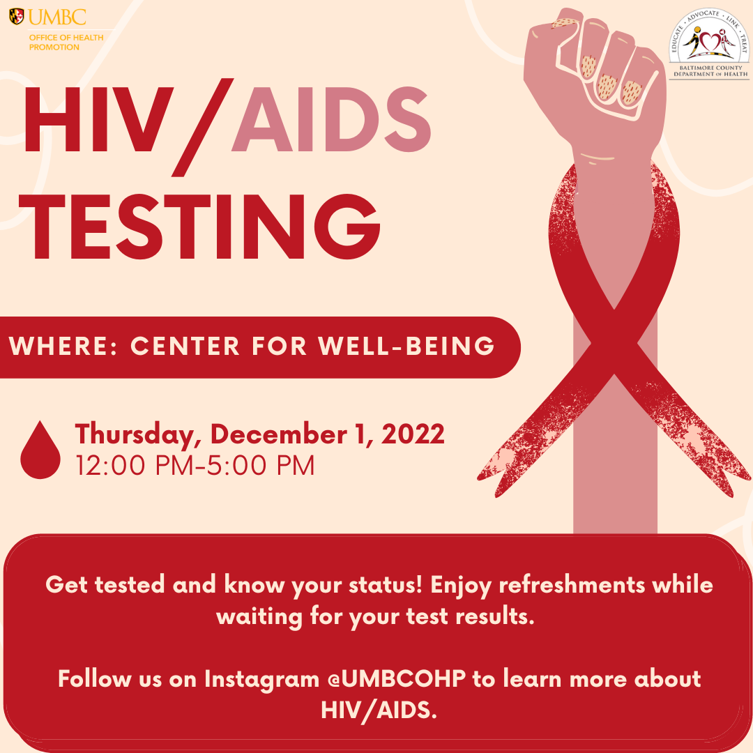 In observance of Worlds AIDS Day, join us and the Baltimore County Department of Health for our HIV/AIDS Testing Event. HIV/AIDS impacts us across gender and sexual identities, race, and class, so it is important to get tested and know your status. Visit our Relaxation Zone in the Center for Well-Being Lobby to learn more about HIV/AIDS prevention while waiting for your test results.