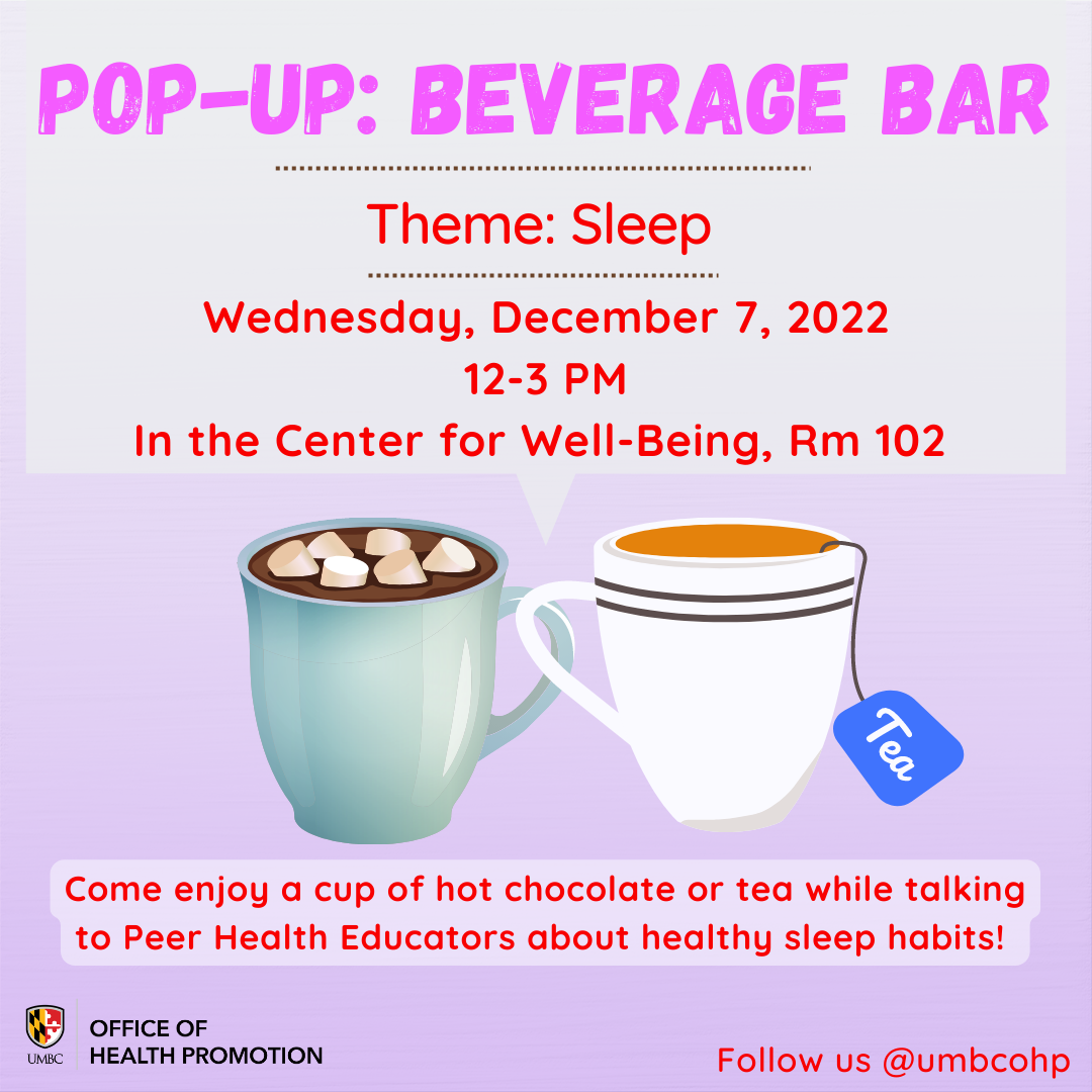 It’s the final Pop-Up Beverage Bar of the semester so make sure you don’t miss it! It's finals week so make sure you get some sleep! Stop by the Office of Health Promotion to speak with our Peer Health Educators and learn about healthy sleep habits while enjoying a cup of hot chocolate or tea.