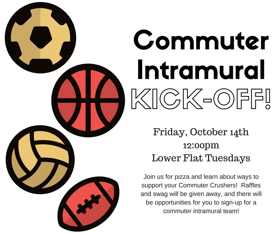 Come enjoy pizza and learn about commuter intramurals! There will be raffles, free Commuter Crushers gear, and opportunities to get more involved with commuter intramurals. We hope to see you there!!