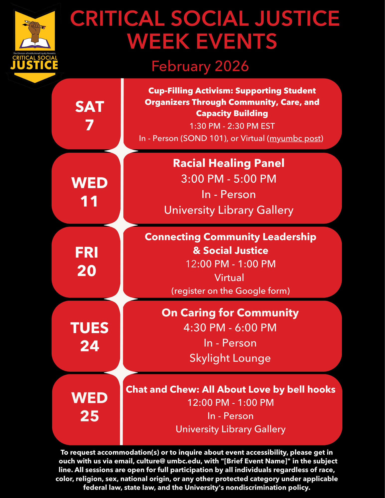 Critical Social Justice (CSJ) Week is a campus-wide initiative dedicated to deepening our collective understanding of equity, inclusion, and community care. Through panels, workshops, and creative programming, CSJ Week invites students, staff, and faculty to engage in meaningful conversations about justice and belonging within and beyond the university.