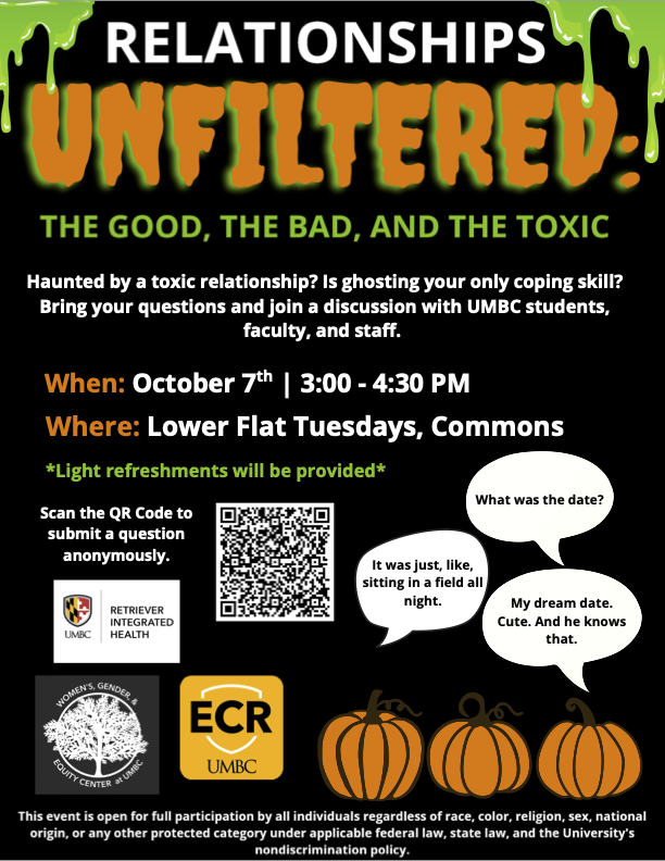 It is common to feel confused about topics like boundaries, expectations, and communication. Relationships are complicated! Bring your questions and join a discussion with UMBC students, faculty, and staff.